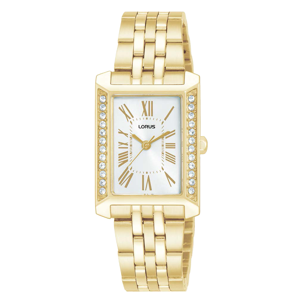 This timepiece is designed for classic luxe style. Its rectangular dial showcases a bright silvery-white sunray effect while the gold-coloured hands and Roman numeral hour markers complement the overall aesthetic, creating a harmonious and refined look. The gold coloured Stainless steel bracelet is comfortably stylish; with a water resistance of up to 50 metres, this classic piece combines style and practicality.