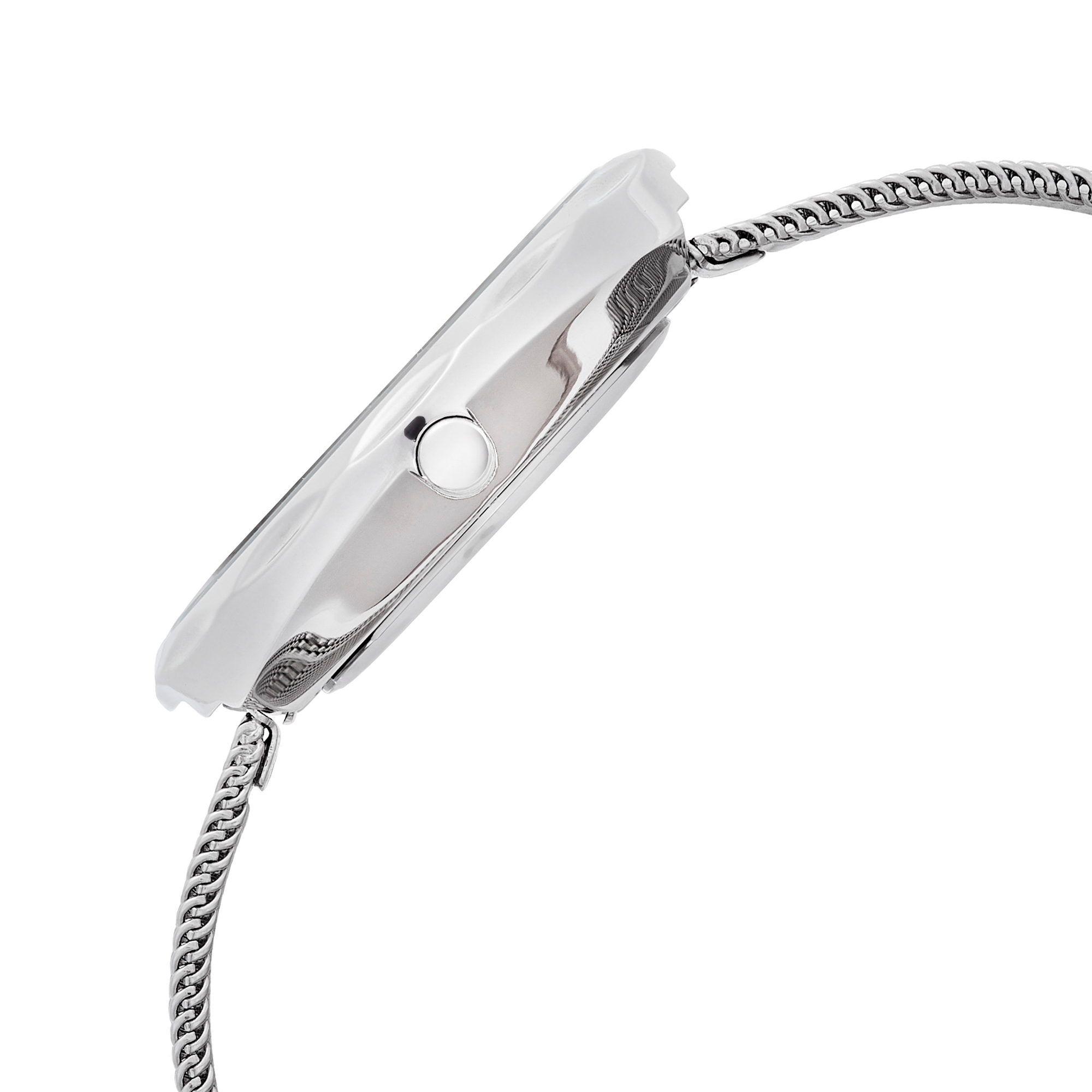 Crafted from stainless steel for wearable durability, the silver-coloured hands and markers provide a sleek contrast, completing the contemporary aesthetic. The classic silver-toned ‘Milanese’ style metal bracelet complements the design.