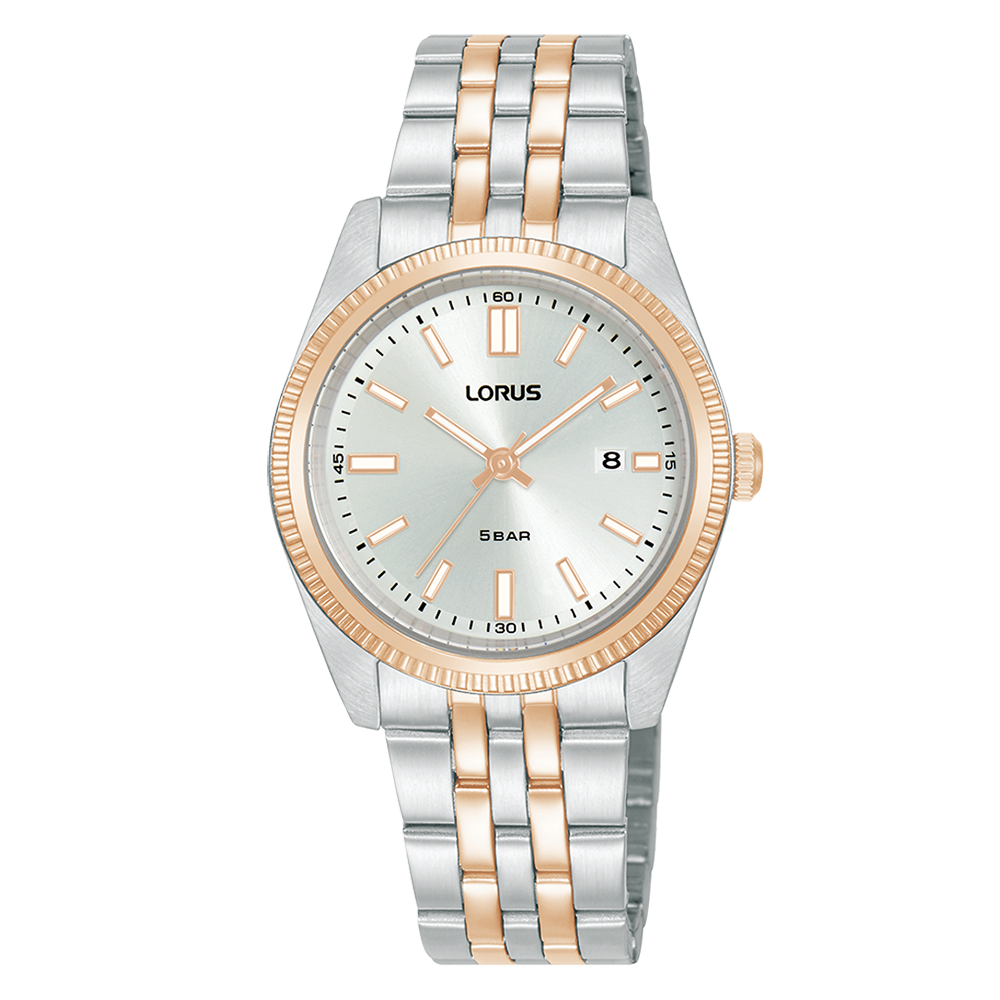 This model showcases a rose gold-coloured fluted bezel wrapped around a polished stainless steel case for graceful sophistication. The silver-coloured sunray dial, adorned with semi-luminous hands, ensures legibility in all conditions, merging functionality with timelessness. Its two tone stainless-steel and rose gold-coloured bracelet sits comfortably on the wrist; water-resistant up to 50 metres, it promises stylish reliability.