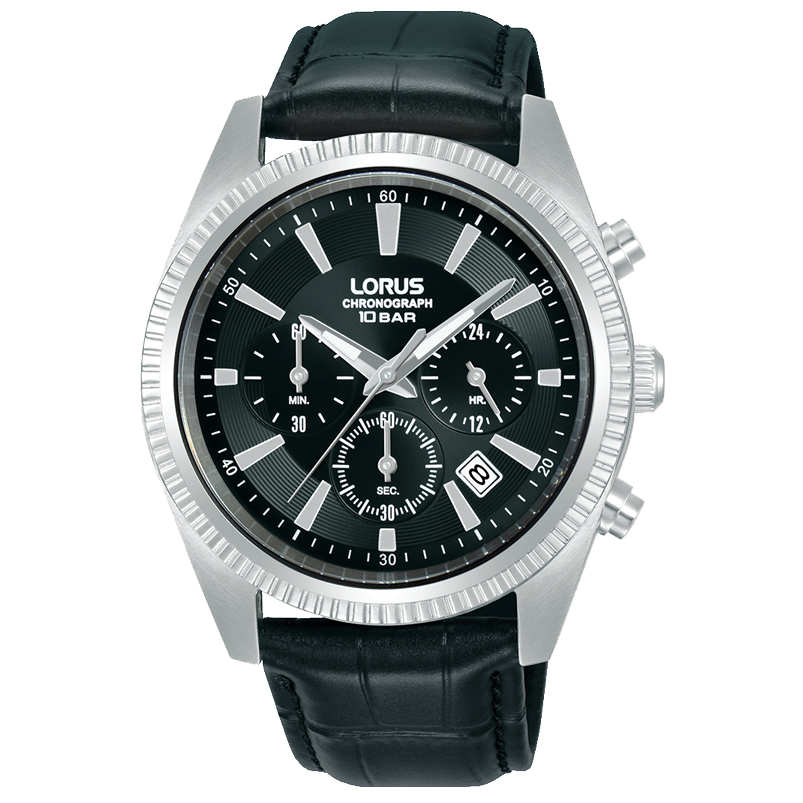 This fluted bezel chronograph watch combines practical features with a modern, understated style. The black sunray dial perfectly complements its leather strap, giving it a distinctive yet versatile look. The luminous hands provide clear visibility, even in low light. The chronograph function is designed for precise time measurement, featuring a stopwatch minute hand, a stopwatch second hand, a stopwatch 1/10-of-a-second hand and a date window.
