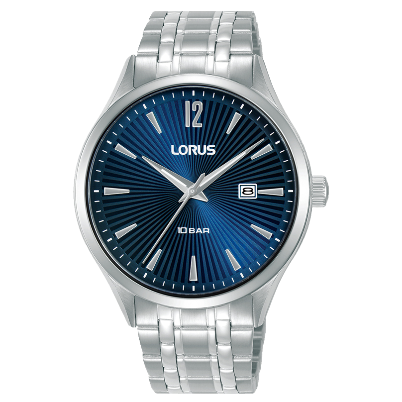 This men’s timepiece is designed for clear-cut timeless elegance. Featuring a dark blue sunray dial with a pressed pattern finish, it has a sophisticated and refined look. The semi-luminous hands ensure readability in various light conditions, while the date window adds a practical touch for everyday convenience. With water resistance up to 100 metres, this watch combines style and functionality, making it an ideal accessory for both everyday wear and special occasions.