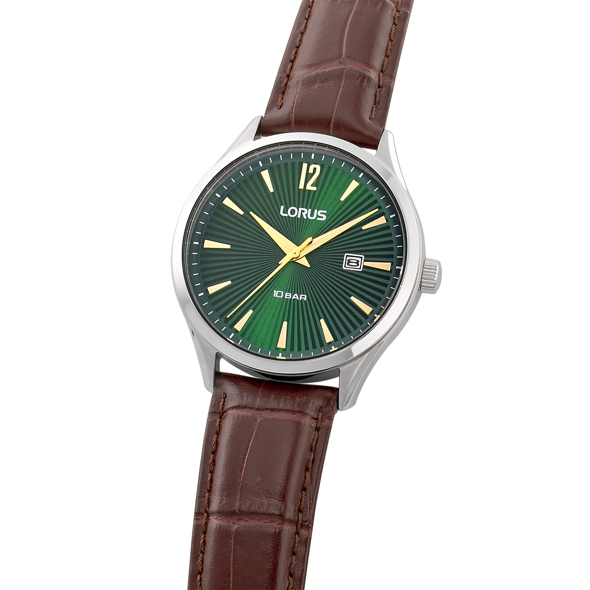 This men’s timepiece is designed for clear-cut timeless elegance. Featuring a dark green sunray dial with a pressed pattern finish, it has a sophisticated and refined look. The semi-luminous hands ensure readability in various light conditions, while the date window adds a practical touch for everyday convenience. With water resistance up to 100 metres, this watch combines style and functionality, making it an ideal accessory for both everyday wear and special occasions.