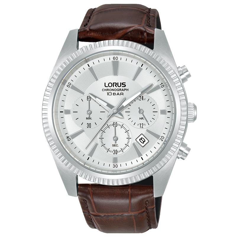 This fluted bezel chronograph watch combines practical features with a modern, understated style. The silvery-white sunray dial perfectly complements the brown leather strap, giving it a distinctive yet versatile look. The luminous hands provide clear visibility, even in low light. The chronograph function is designed for precise time measurement, featuring a stopwatch minute hand, a stopwatch second hand, a stopwatch 1/10-of-a-second hand hand and a date window.
