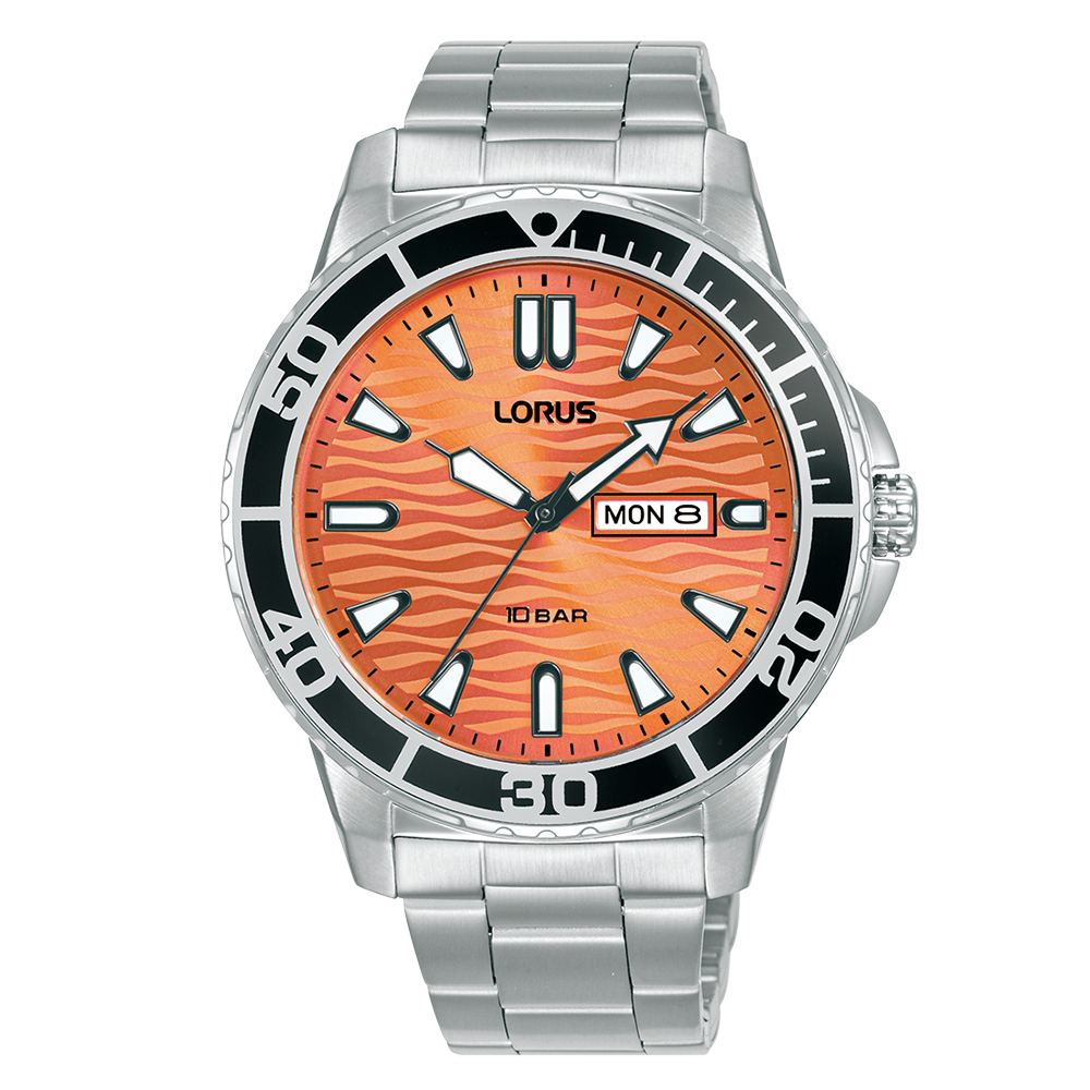 A classic sports watch with a twist – the dark orange dial on this Lorus design showcases an eye-catching Seigaiha-mon wave inspired Japanese pattern. Similar to those familiar repetitive curved visuals signifying surges of good luck, power and resilience, the horizontal style is repeated.