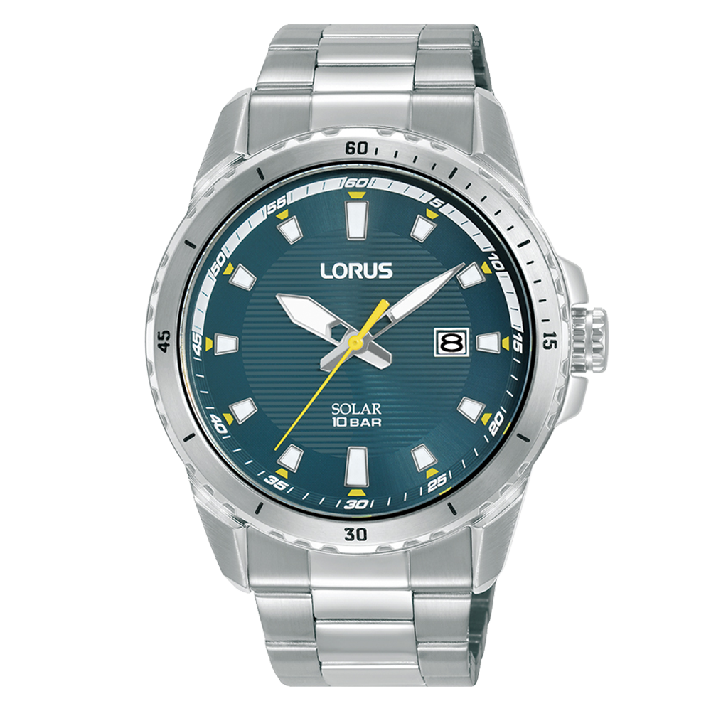 Solar charging from any light source – artificial and natural light – ensures both reliability and convenience. Showcasing a blue textured sunray dial with contrasting yellow accents, its stainless steel case combines durability with a sleek, contemporary look. The watch is complemented by luminous markers for visibility in any light and a stainless steel bracelet with a protected crown; the finishing touches to its timeless design.